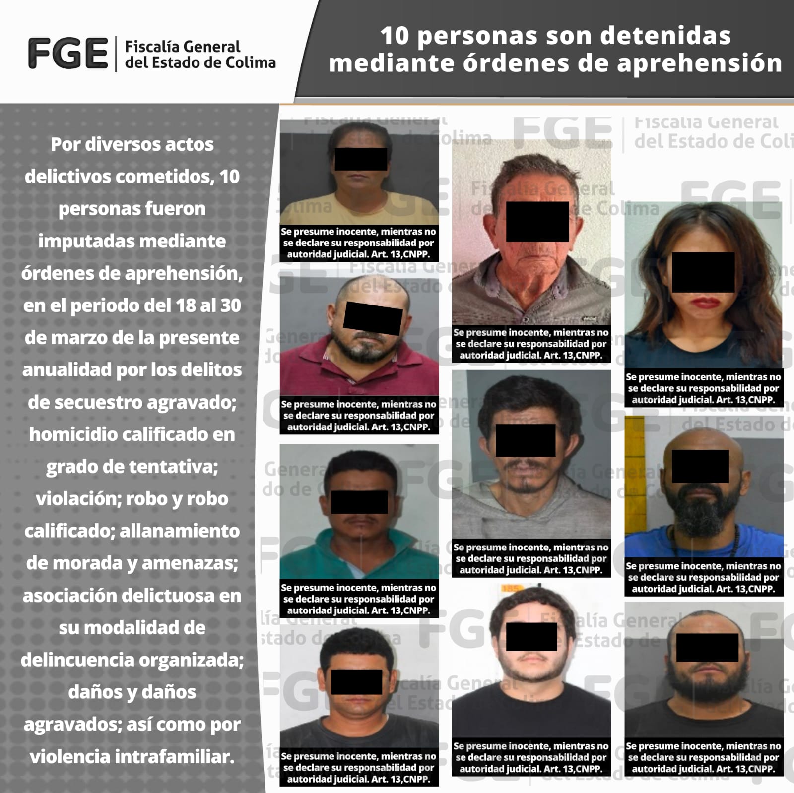 Por diversos actos delictivos cometidos, 10 personas fueron imputadas mediante órdenes de aprehensión, en el periodo del 18 al 30 de marzo de la presente anualidad por los delitos de secuestro agravado; homicidio calificado en grado de tentativa; violación; robo y robo calificado; allanamiento de morada y amenazas; asociación delictuosa en su modalidad de delincuencia organizada; daños y daños agravados; así como por violencia intrafamiliar.