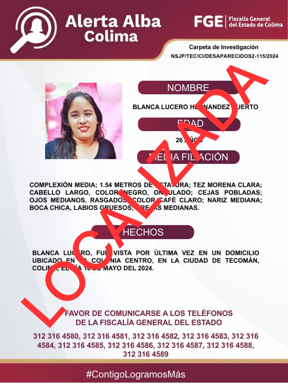 Blanca ya fue localizada. El Protocolo Alerta Alba agradece el apoyo de medios de comunicación y la colaboración de la sociedad mediante llamadas a las líneas 089 y 911, así como la información que se compartió a través de redes sociales.