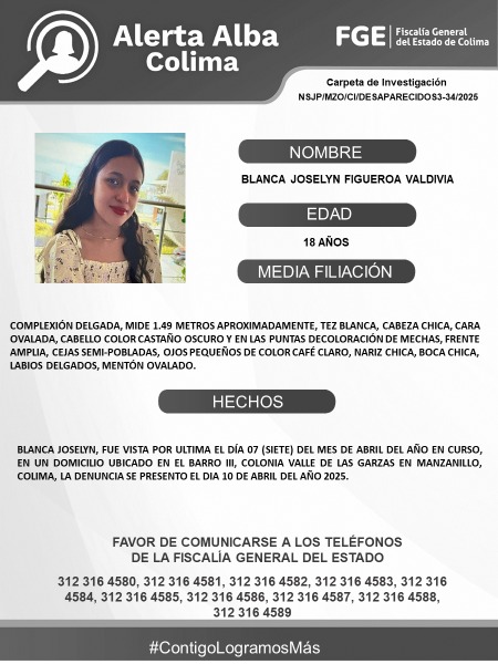 Favor de comunicarse a los teléfonos de la Fiscalía General del Estado. 312 316 45 80, 312 316 45 81, 312 316 45 82, 312 316 45 83, 312 316 45 84, 312 316 45 85, 312 316 45 86, 312 316 45 87, 312 316 45 88, 312 316 45 89.