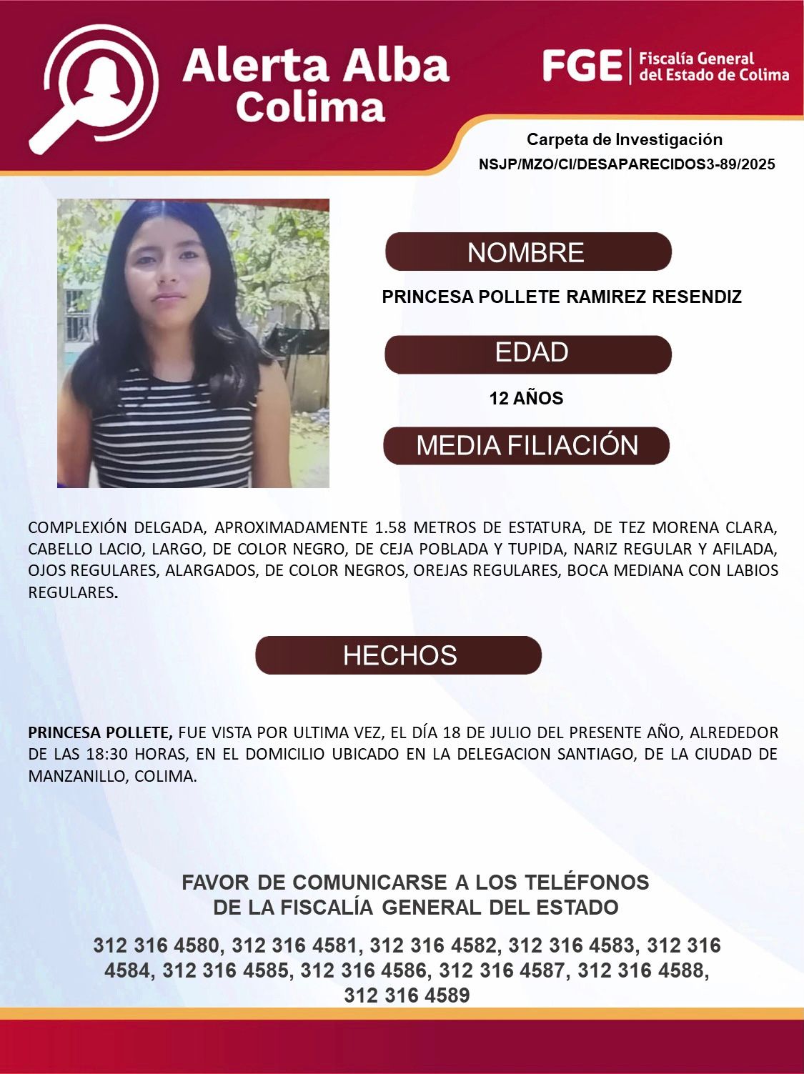 Favor de comunicarse a los teléfonos de la Fiscalía General del Estado. 312 316 45 80, 312 316 45 83, 312 316 45 84, 312 316 45 85, 312 316 45 86, 312 316 45 87, 312 316 45 88, 312 316 45 89.