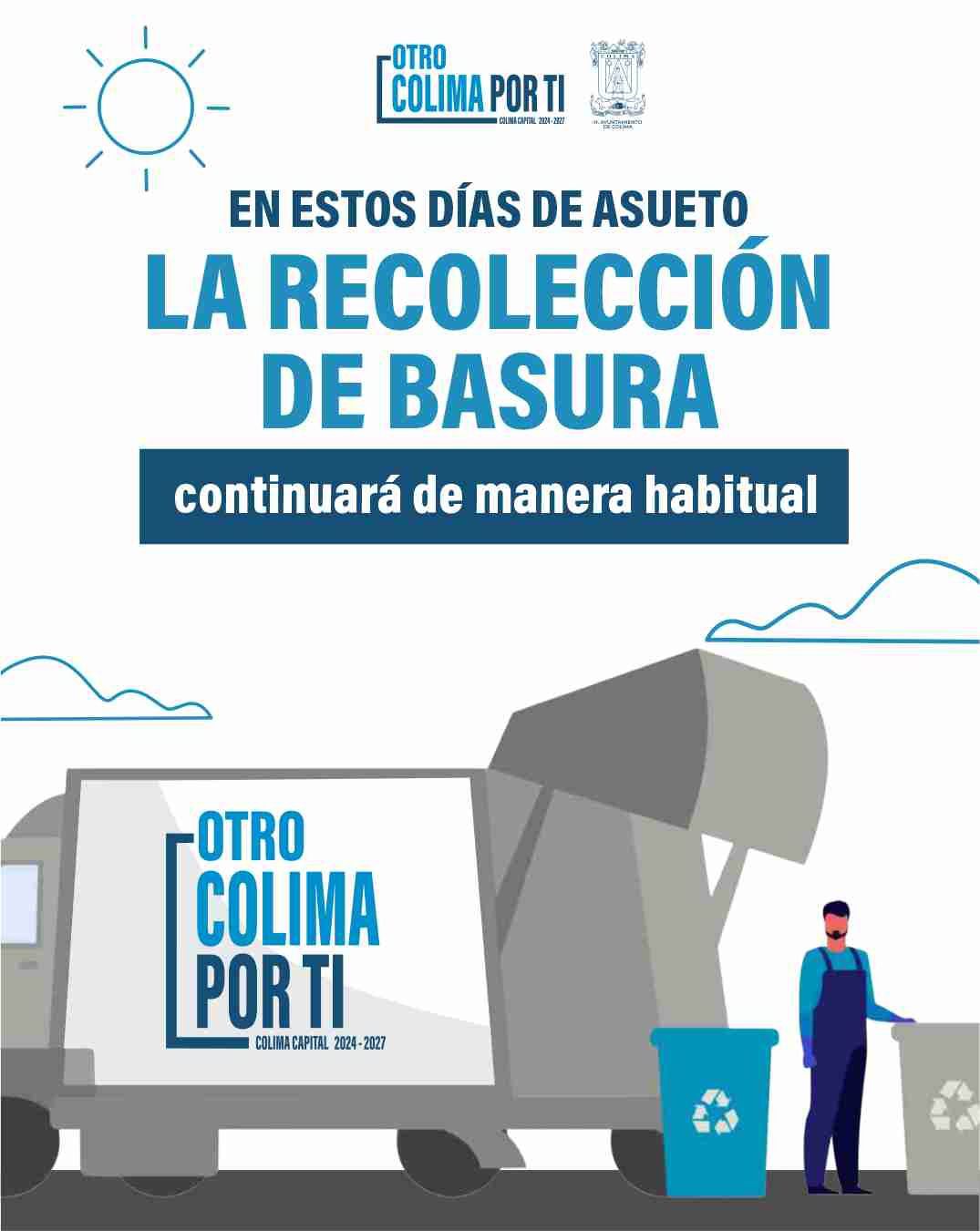 El Ayuntamiento de Colima informa que durante los días de asueto del mes de Noviembre, el servicio de recolección de basura continuará de manera habitual, por lo que se invita a la ciudadanía a sacar sus desechos en los días y horarios acostumbrados.