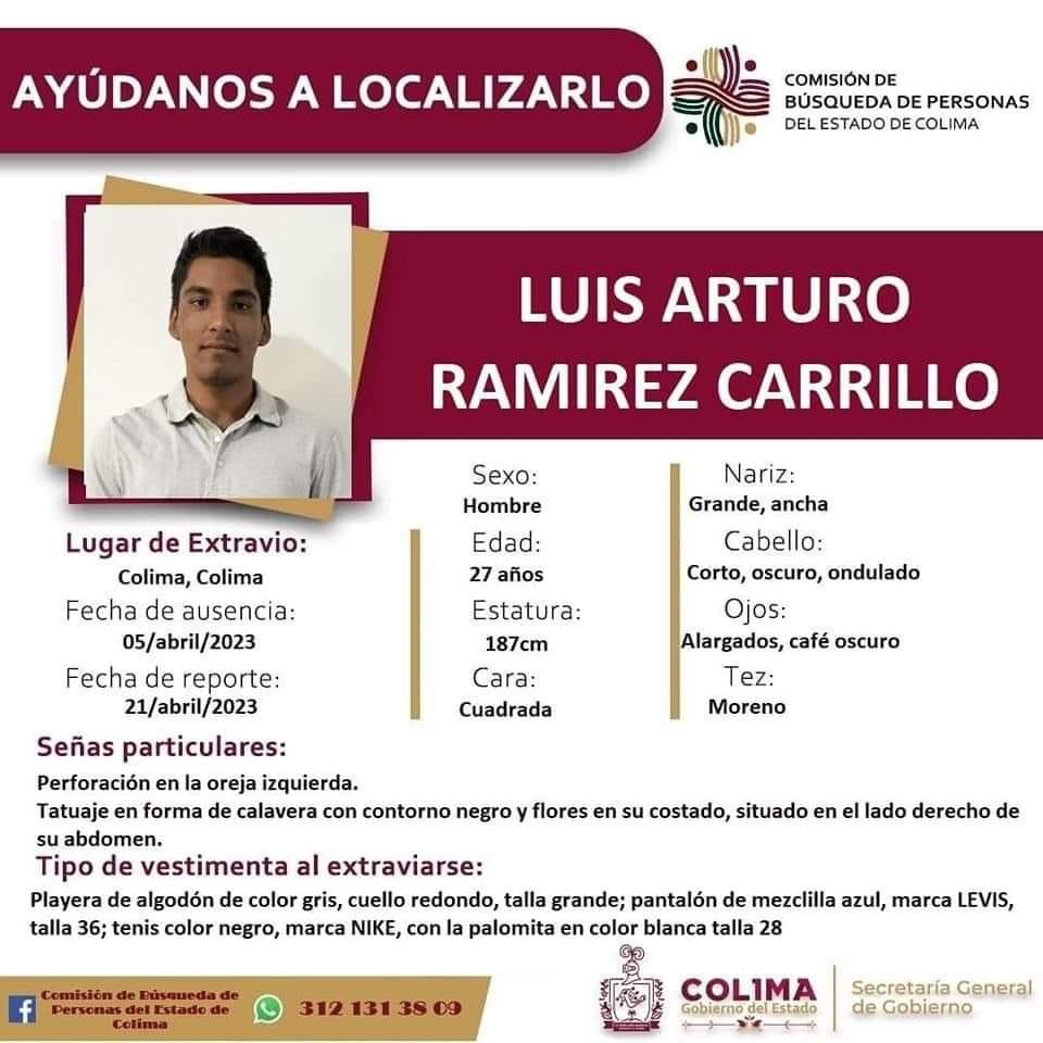 Pedimos su valiosa colaboración para localizar a la persona desaparecida en el municipio de Colima, Colima, quien responde al nombre LUIS ARTURO RAMIREZ CARRILLO.