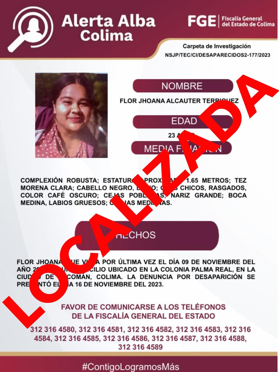 Flor Jhoana ya fue localizada. El Protocolo Alerta Alba agradece el apoyo de medios de comunicación y la colaboración de la sociedad mediante llamadas a las líneas 089 y 911, así como la información que se compartió a través de redes sociales.