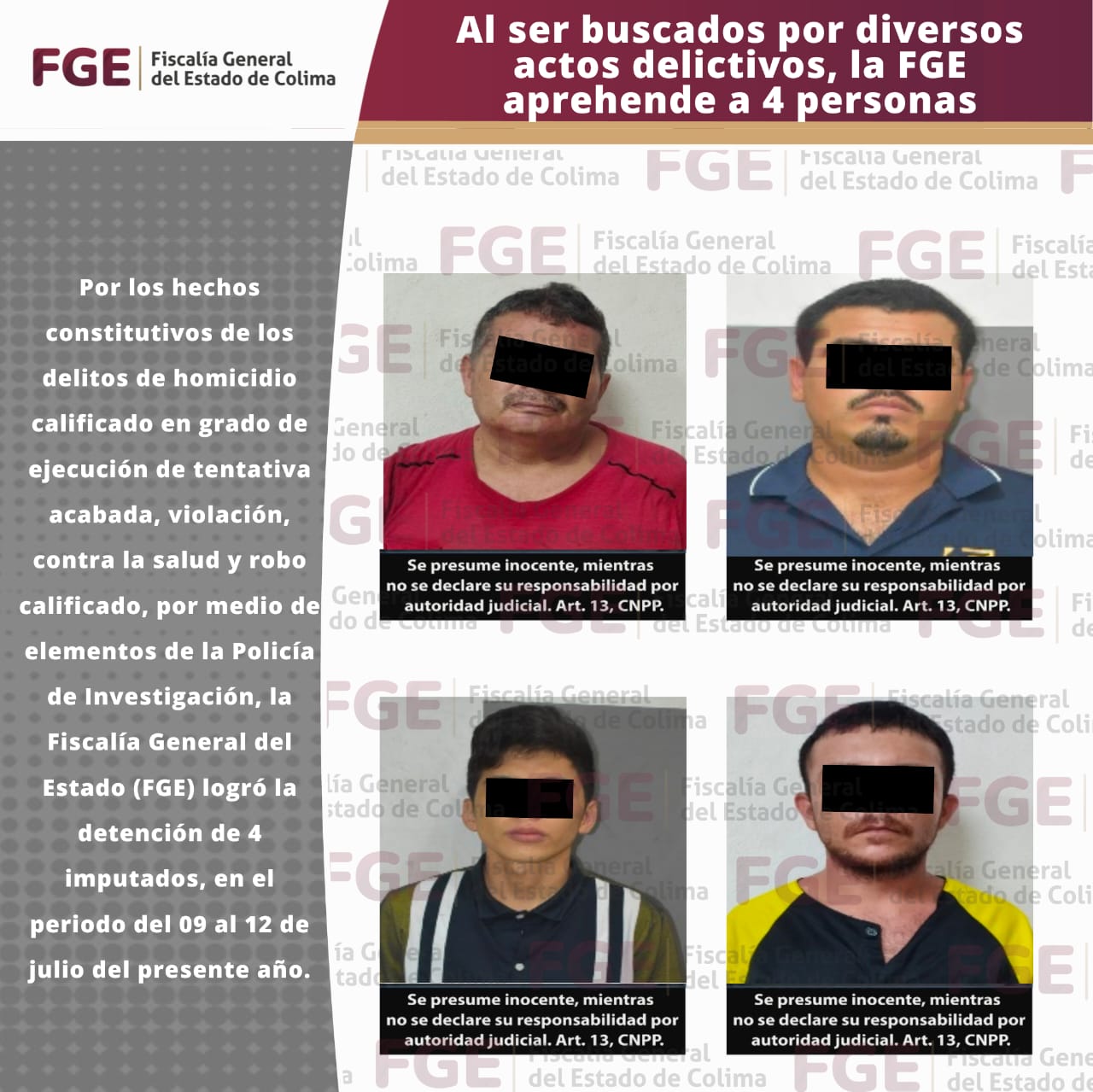 Por los hechos constitutivos de los delitos de homicidio calificado en grado de ejecución de tentativa acabada, violación, contra la salud y robo calificado, por medio de elementos de la Policía de Investigación, la Fiscalía General del Estado (FGE) logró la detención de 4 imputados, en el periodo del 09 al 12 de julio del presente año.