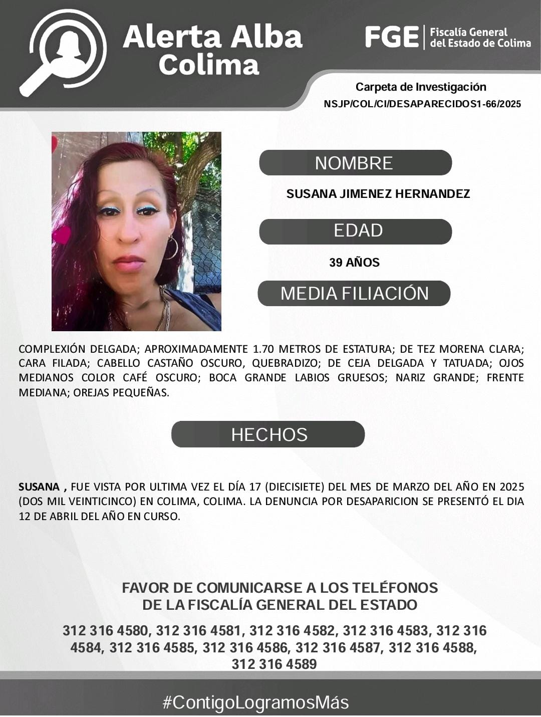 Favor de comunicarse a los teléfonos de la Fiscalía General del Estado. 312 316 45 80, 312 316 45 83, 312 316 45 84, 312 316 45 85, 312 316 45 86, 312 316 45 87, 312 316 45 88, 312 316 45 89.