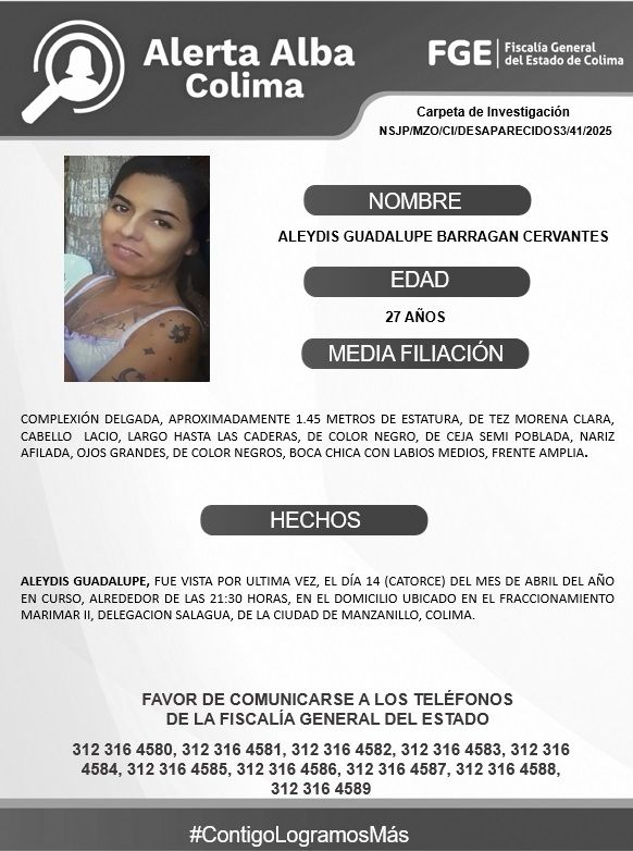 Favor de comunicarse a los teléfonos de la Fiscalía General del Estado. 312 316 45 80, 312 316 45 83, 312 316 45 84, 312 316 45 85, 312 316 45 86, 312 316 45 87, 312 316 45 88, 312 316 45 89.