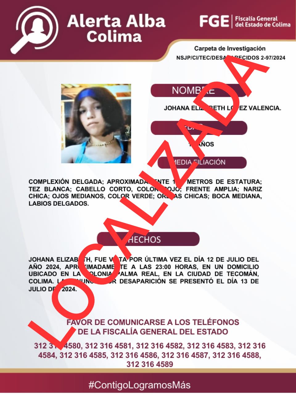 ohana ya fue localizada. El Protocolo Alerta Alba agradece el apoyo de medios de comunicación y la colaboración de la sociedad mediante llamadas a las líneas 089 y 911, así como la información que se compartió a través de redes sociales.