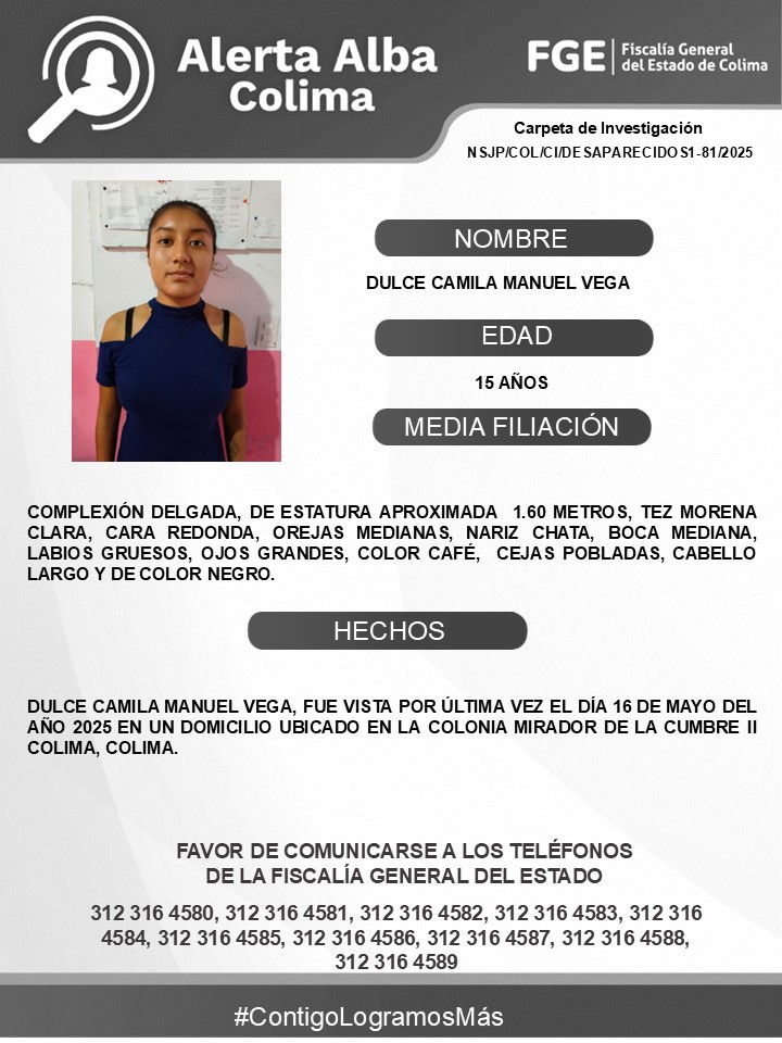 Favor de comunicarse a los teléfonos de la Fiscalía General del Estado. 312 316 45 80, 312 316 45 83, 312 316 45 84, 312 316 45 85, 312 316 45 86, 312 316 45 87, 312 316 45 88, 312 316 45 89.