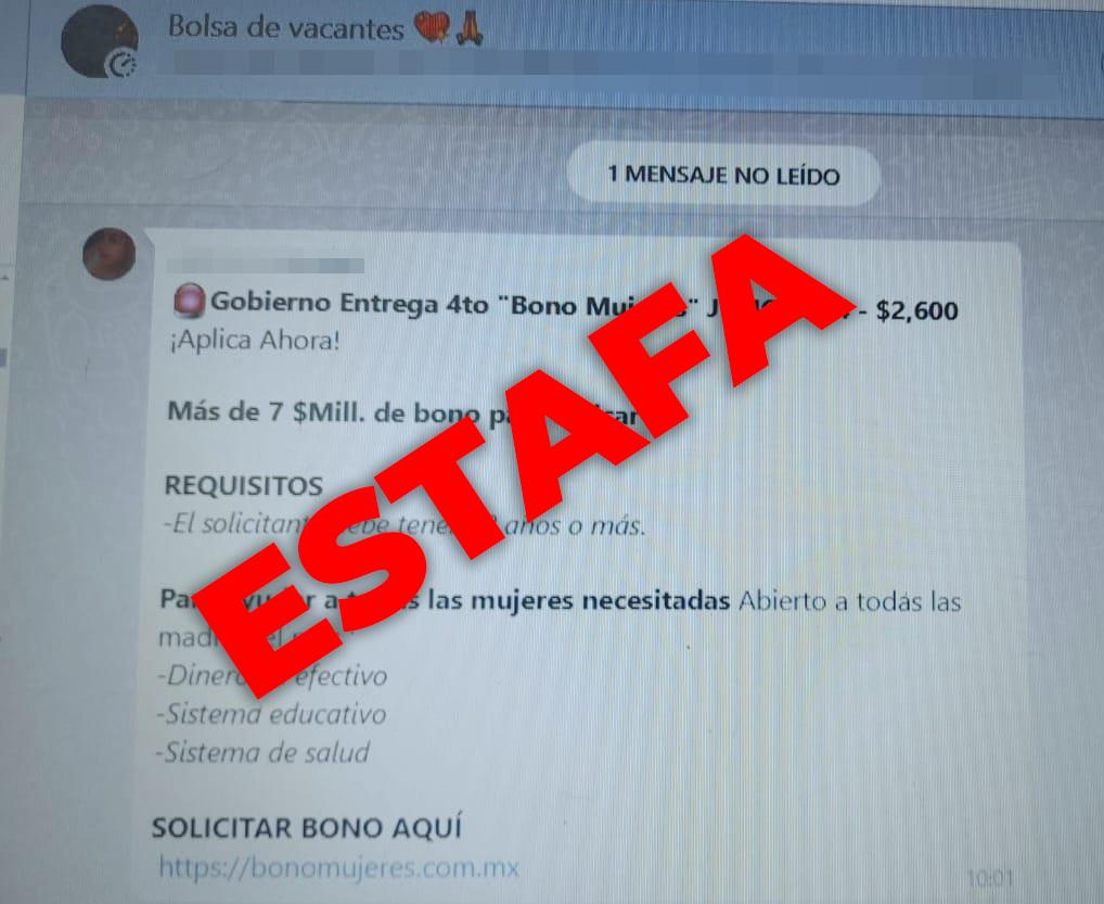 La dependencia estatal previene a la ciudadanía, porque circula un enlace por la plataforma de WhatsApp en el que invitan a solicitar un ‘Bono de Apoyo’ por la cantidad de 2 mil 600 pesos, supuestamente para ayudar a mujeres necesitadas.