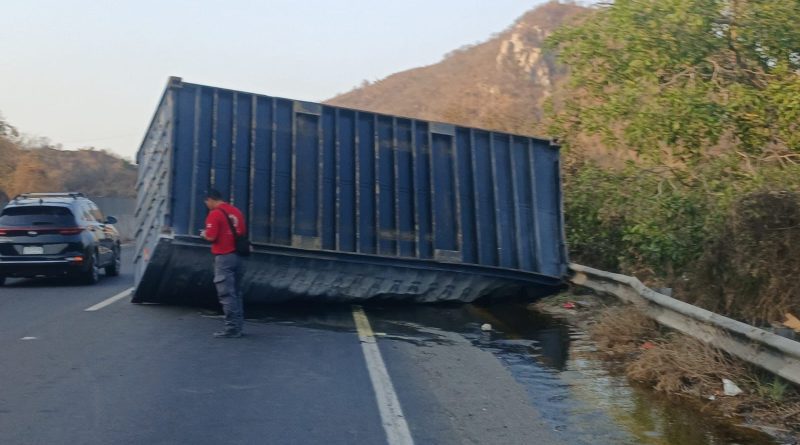 La Unidad Estatal de Protección Civil (UEPC) del Gobierno del Estado de Colima informa que la tarde de este jueves se registró el desprendimiento de un contenedor de un tráiler sobre la autopista Manzanillo a Colima, a la altura de la comunidad de Colomos, lo que provocó la obstrucción de uno de los carriles de circulación.
