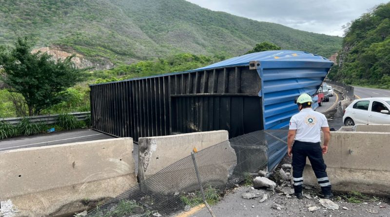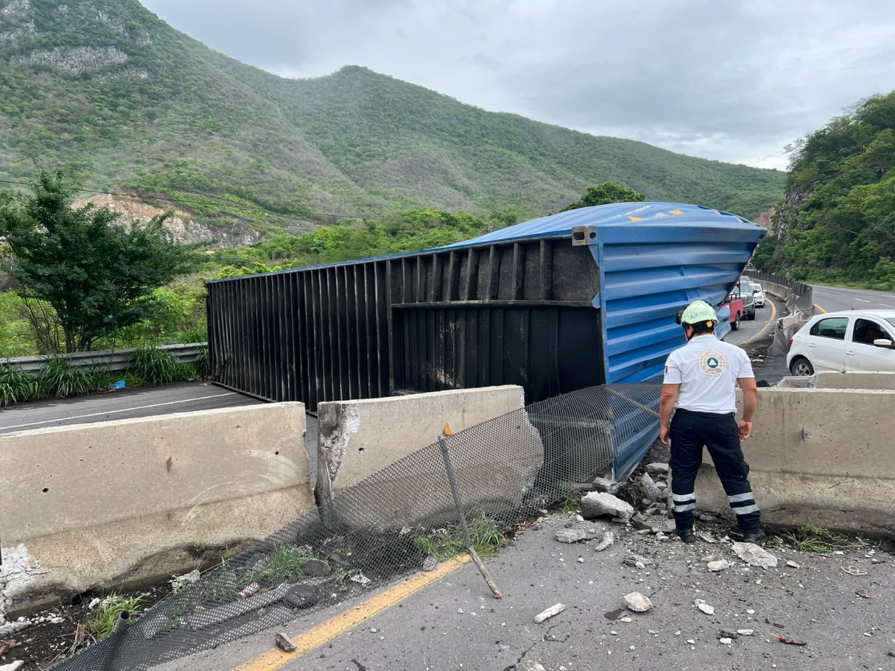 La Unidad Estatal de Protección Civil (UEPC) del Gobierno del Estado de Colima informa que la tarde de este martes se registró un percance sobre la autopista Manzanillo a Colima, a la altura de la curva de La Salada, donde un tractocamión de carga volcó, obstruyendo por completo ambos carriles en sentido del puerto hacia la capital del estado, por lo que exhorta a conducir con precaución y respetar los límites de velocidad, para evitar algún accidente fatal.