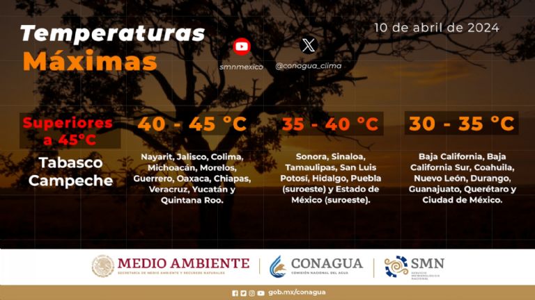 Los estados que ya experimentan altas temperaturas en México son Tabasco y Campeche, superiores a 45º; Nayarit, Jalisco, Colima, Michoacán, Morelos, Guerrero, Oaxaca, Chiapas, Veracruz, Yucatán y Quintana Roo, de entre 40 y 45 °C; Sonora, Sinaloa, Tamaulipas, San Luis Potosí, Hidalgo, Puebla (suroeste) y Estado de México (suroeste), de 35 a 40 grados celsius, mientras que Baja California, Baja California Sur, Coahuila, Nuevo León, Durango, Guanajuato, Querétaro y Ciudad de México de 30 a 35 °C.