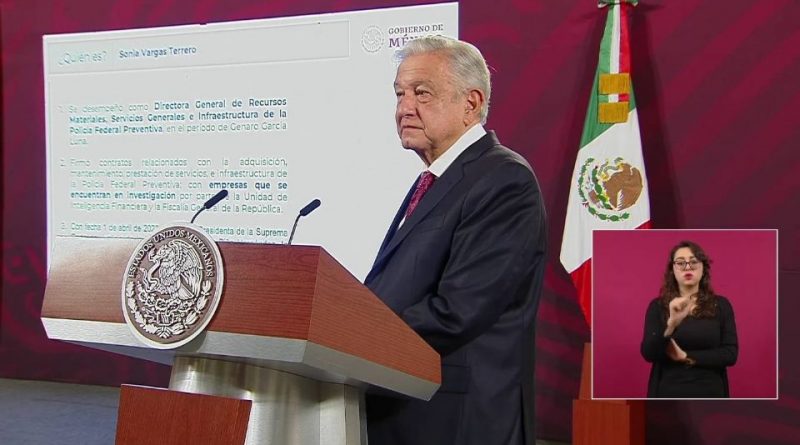 López Obrador instruyó proyectar una ficha informativa, con sellos del gobierno federal que señala que Sonia Vargas Terreno fue directora de Recursos Materiales, Servicios Generales e Infraestructura de la Policía Federal Preventiva en el periodo de Genaro García Luna.