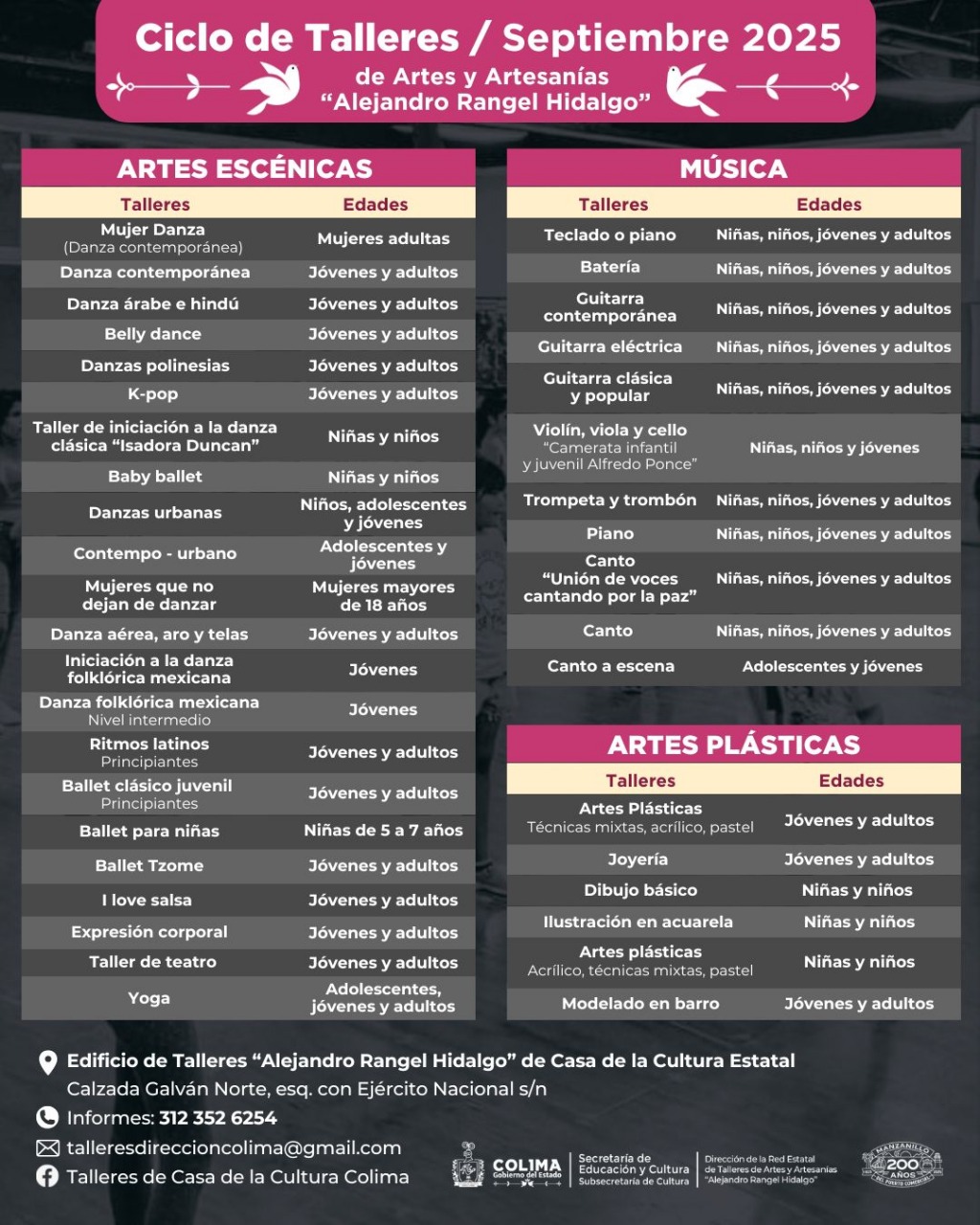 *Los talleres de artes escénicas, música y artes plásticas se impartirán de septiembre a diciembre