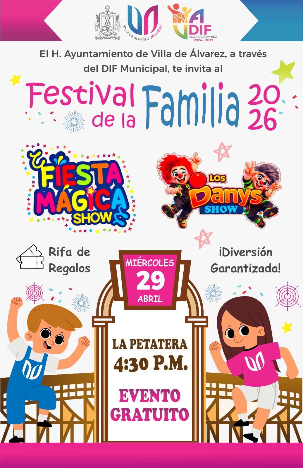 Villa de Álvarez, Col.- Para festejar a las niñas y niños de Villa de Álvarez y de todo el estado de Colima, la Presidenta Tey Gutiérrez Andrade anunció la celebración del Festival de la Familia 2026 en la Plaza de Toros La Petatera, el cual se realizará el miércoles 29 de abril a las 4:30 de la tarde.
