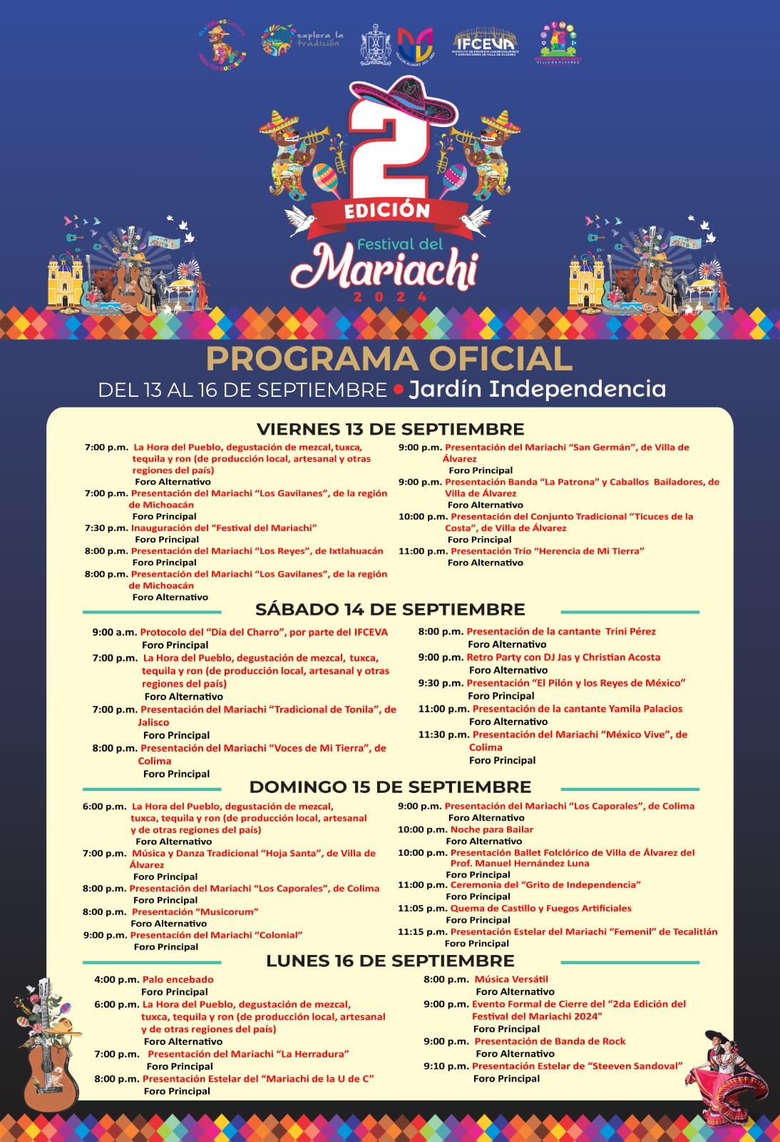 El viernes 13 de septiembre la primer actividad será a las 7:00 de la tarde, con La Hora del Pueblo, una degustación de mezcal, tuxca, tequila y ron (de producción local, artesanal y otras regiones del país), en el Foro Alternativo, que se localizará al norte del Jardín Independencia, en la calle Tiburcio Aguilar; a esa misma hora, pero en el Foro Principal, en la parte sur del Jardín Independencia, se presentará el Mariachi “Los Gavilanes” de Michoacán, y a las 7:30 de la tarde, también en el Foro Principal, se realizará la inauguración del “Segundo Festival del Mariachi”.
