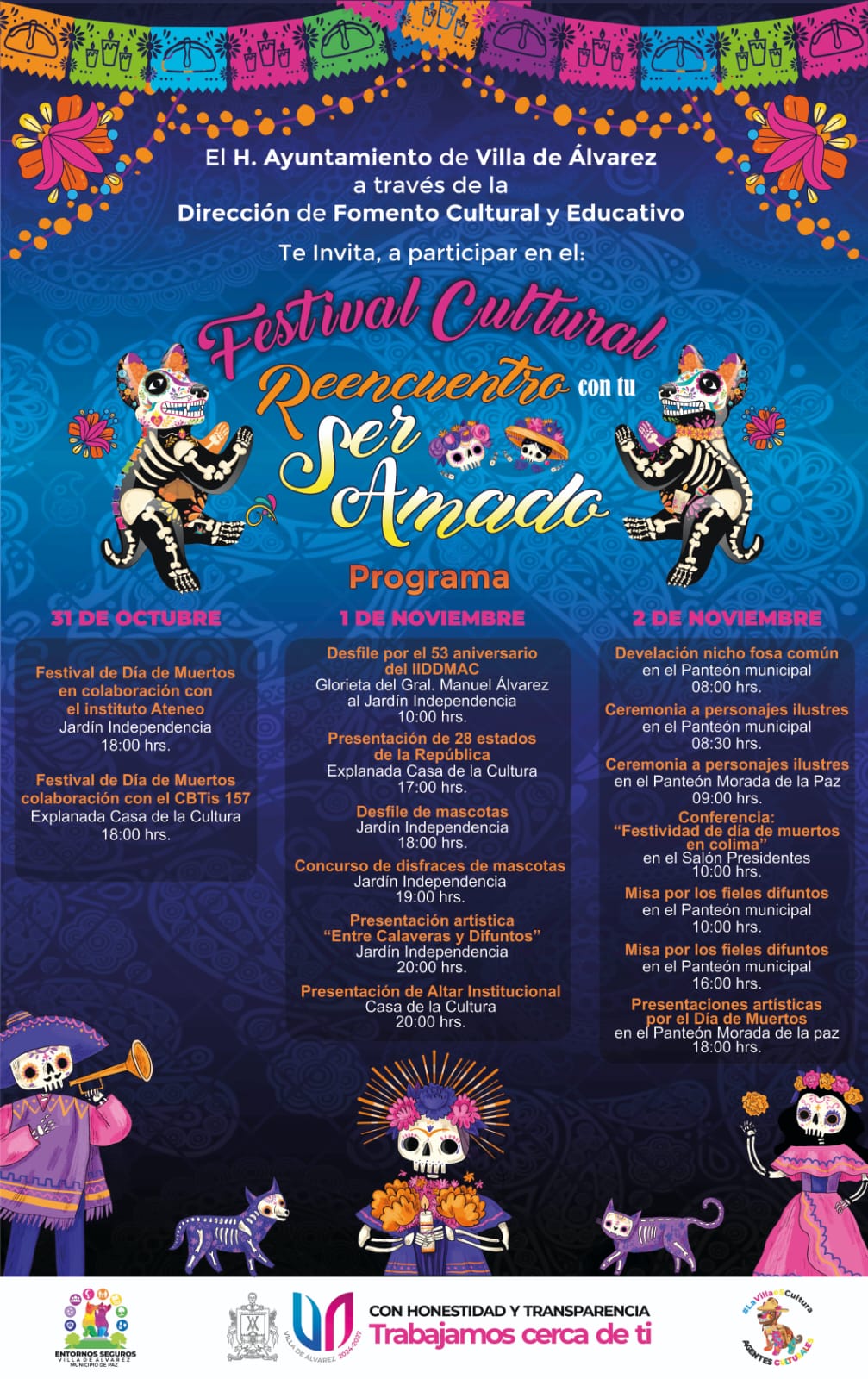 Las actividades iniciarás el viernes 31 de octubre con dos festivales que se realizarán de manera conjunta a las a las 6:00 de la tarde, uno en el Jardín Independencia, en el que participará la comunidad académica de la Universidad Ateneo, y el otro en la Explanada de la Casa de la Cultura de Villa de Álvarez, el cual será celebrado en coordinación con el CBTIS 157.