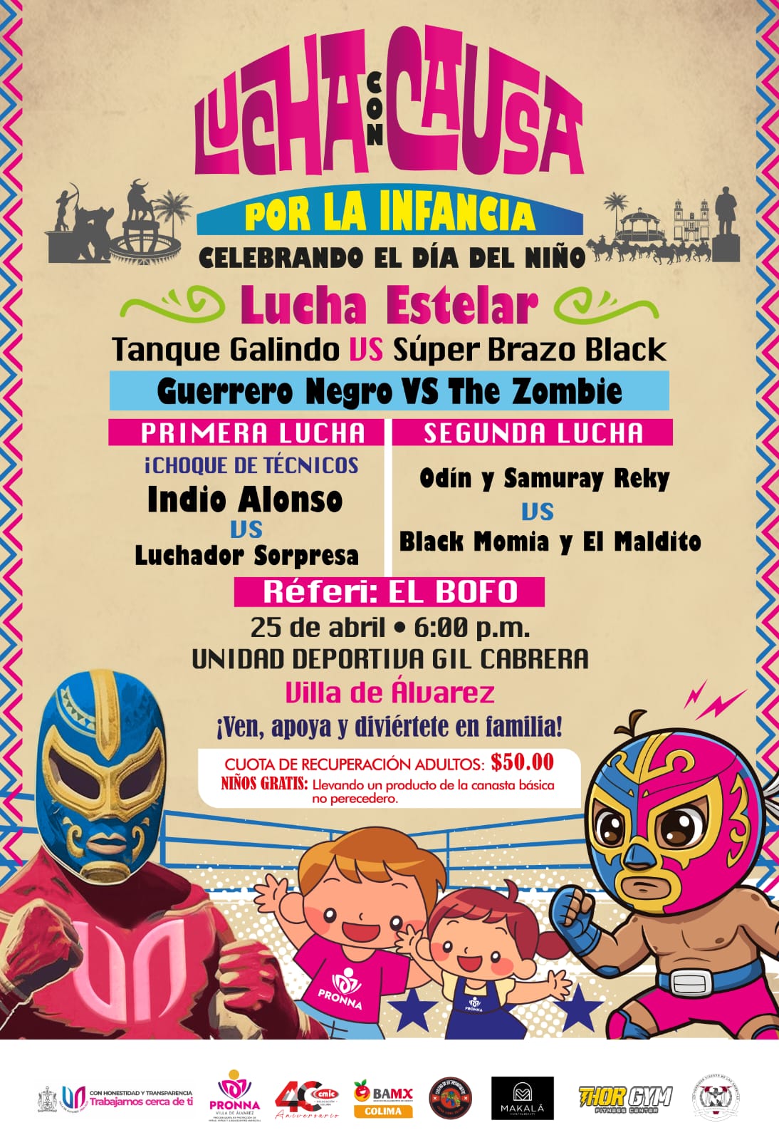 En la función “Lucha con causa por la infancia celebrando el Día del Niño”, el enfrentamiento estelar será protagonizado por los luchadores Tanque Galindo contra Súper Brazo Black; también pelearán Guerrero Negro Vs. Zombie; el Indio Alonzo contra un luchador sorpresa; para cerrar con una lucha de relevos sencillos: Odín y Samuray Reky contra Black Momia y El Maldito.