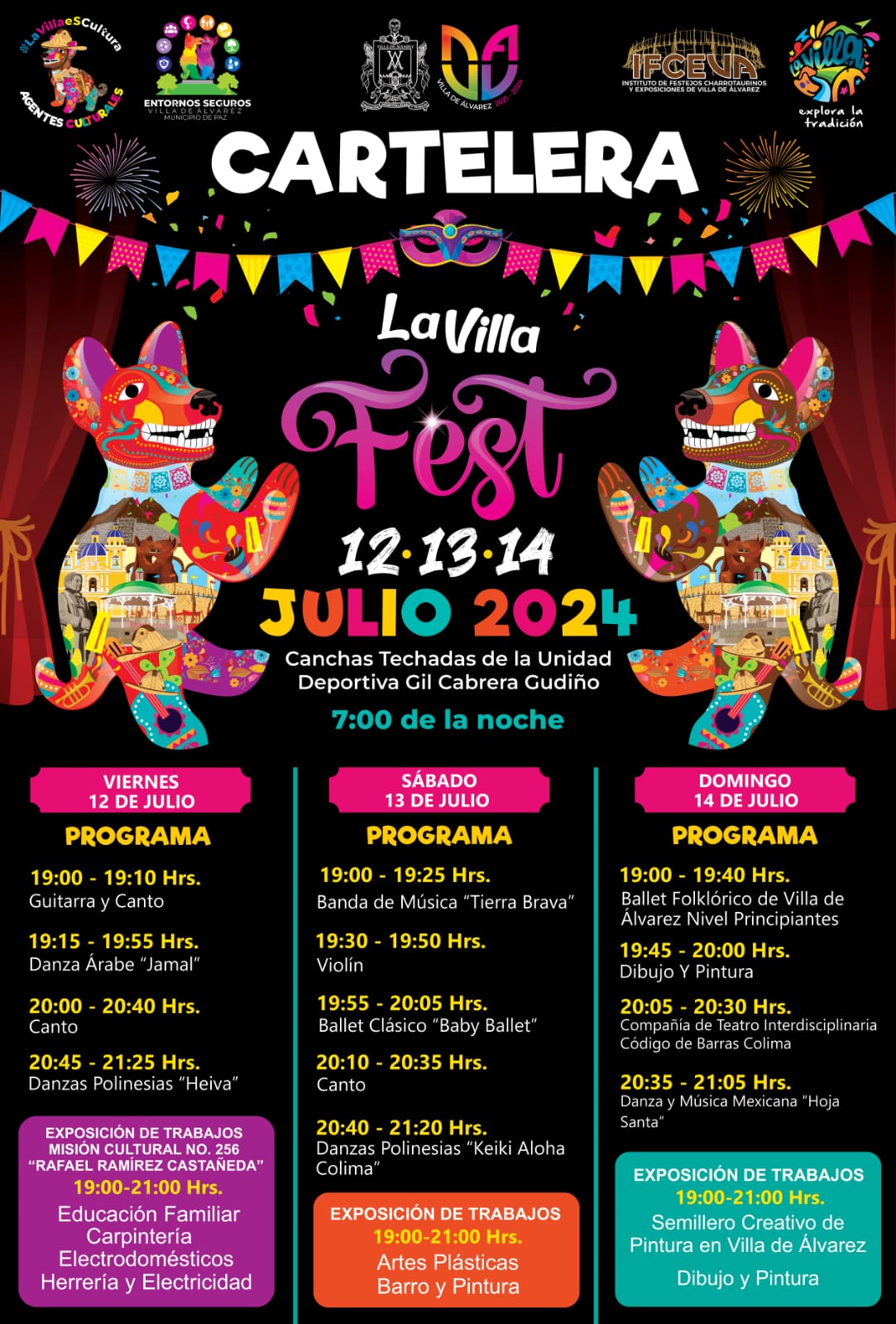 La Villa Fest iniciará el viernes 12 de julio a las 7 de la noche, con la presentación de Mateo Quintero Orozco y Abraham Brizuela Maldonado, con un concierto de guitarra y canto; les seguirán la Danza Árabe Jamal, cantantes de la Casa de la Cultura, una muestra en vivo de dibujo y pintura, y las Danzas Polinesias “Heiva”, con las que finalizarán las actividades musicales, dancísticas y plásticas.