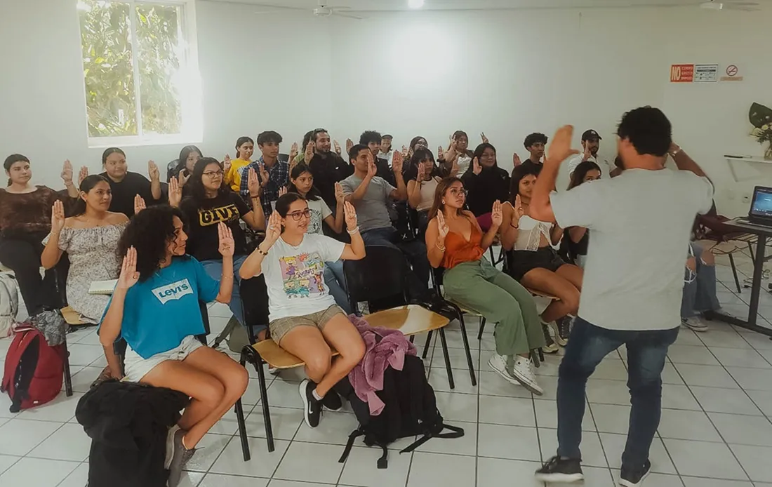 Durante el taller, las y los estudiantes comprenderán la importancia de dominar un lenguaje incluyente y los beneficios como sociedad para que más personas se involucren y se sumen a tener estos conocimientos. Ya realizaron una práctica donde conocieron el abecedario, los números, y cómo decir nombres y lugares.