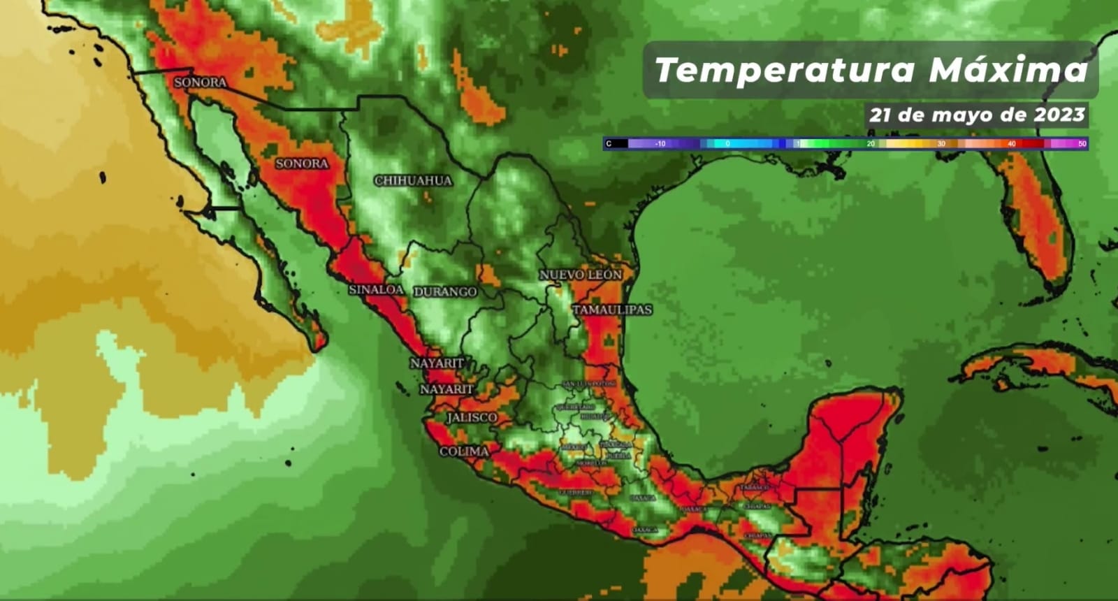 El organismo dependiente de la Comisión Nacional de Agua (Conagua), fuente oficial del Gobierno de México, informó que las temperaturas máximas podrían alcanzar de 40 a 45°C en: Colima, Jalisco, Michoacán, Guerrero, Nayarit y Sinaloa; en contraste las temperaturas mínimas descenderían de 0 a 5°C: zonas montañosas de Chihuahua y Durango.