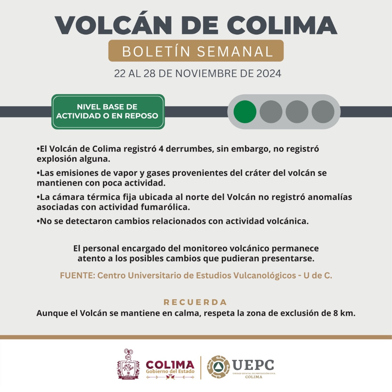 Del viernes 22 al jueves 28 de noviembre de 2024, el Centro Universitario de Estudios Vulcanológicos (CUEV) de la Universidad de Colima, contabilizó de forma manual cuatro derrumbes, ninguno de ellos relacionado con actividad volcánica.