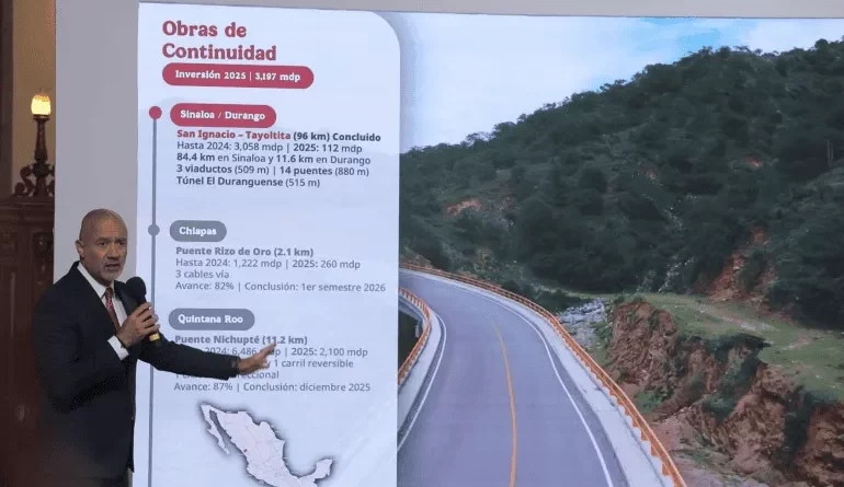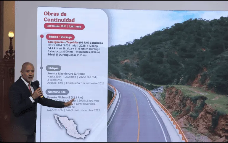 Entre las obras de continuidad se encuentra un tramo carretero en San Ignacio-Tayoltita de 96 km; un Puente Rizo de Oro, Chiapas; Puente Nichupté, Quintana Roo, entre otros. (Informador)