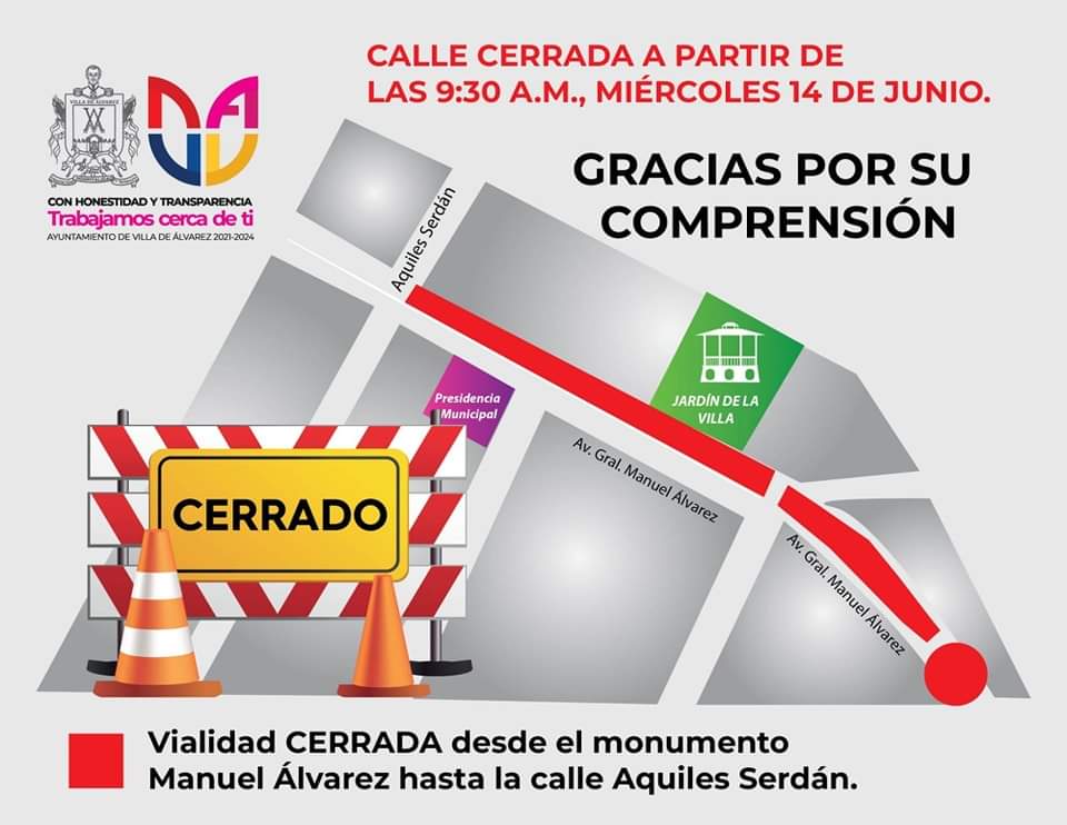 Por trabajos que realizará la CFE para sustituir un poste de luz que fue derribado debido a un accidente que se suscitó la noche de ayer en la esquina de Leandro Valle con Av. Manuel Álvarez, esta vialidad estará cerrada desde el monumento a Manuel Álvarez hasta la calle Aquiles Serdan en ambos sentidos.