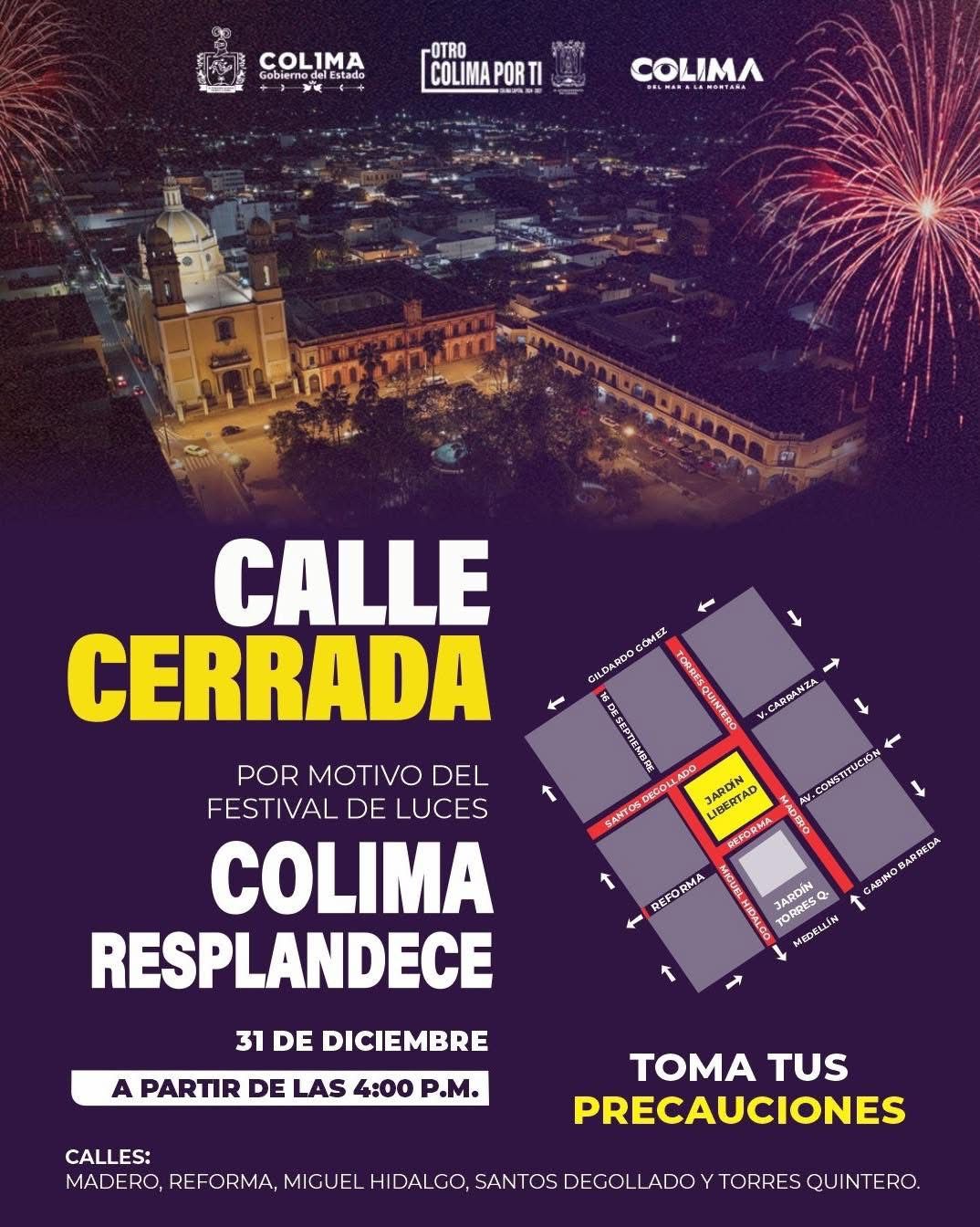Con motivo del Festival de Luces Colima Resplandece, este 31 de diciembre, se realizará el cierre de calles a partir de las 4:00 p.m. en el primer cuadro de la ciudad.
