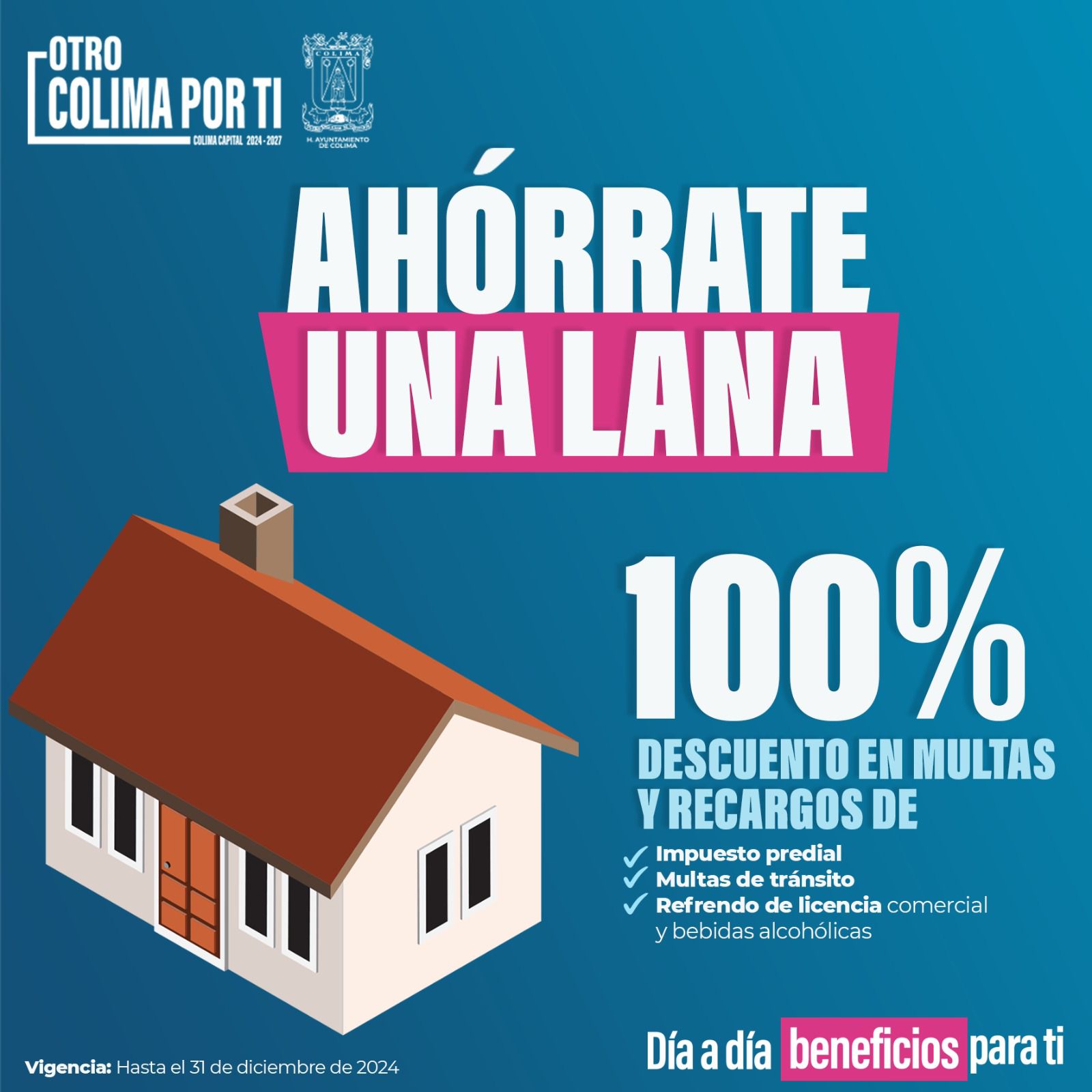 Colima, Col., 22 de noviembre de 2024. El Ayuntamiento de Colima, a través de la Tesorería Municipal, invita a los contribuyentes del municipio que no han realizado el pago del impuesto predial, así como el refrendo de licencias comerciales, industriales y de servicios correspondientes al ejercicio fiscal 2024, a aprovechar los beneficios del descuento del 100% en recargos generados y multas impuestas por falta de pago.