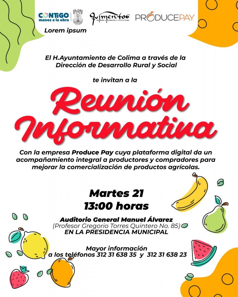 A través de la dirección de Desarrollo Rural y Social, el Ayuntamiento de Colima invita a productores a participar en la reunión informativa, este martes 21 de marzo, a las 13:00 horas, en el Auditorio Manuel Álvarez, en el centro histórico de la capital.