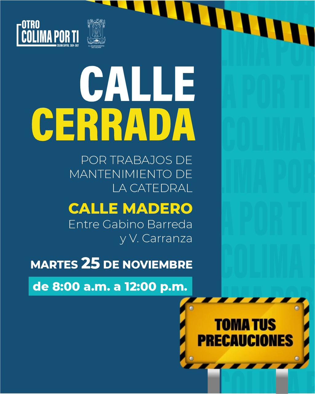 Colima, Col., 25 de noviembre de 2025.- El Gobierno Municipal de Colima informa a la ciudadanía que este martes 25 de noviembre se llevará a cabo el cierre temporal de la calle Madero, en el tramo comprendido entre Gabino Barreda y Venustiano Carranza, debido a trabajos de mantenimiento que se realizarán en la Catedral Basílica Menor.