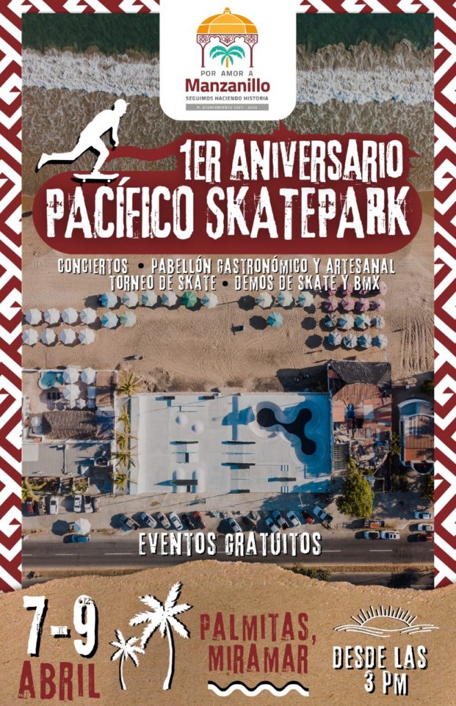 Con motivo del primer aniversario del Pacífico Skatepark, el Ayuntamiento de Manzanillo celebrará con un gran evento, del 7 al 9 de abril, este espacio deportivo será sede de la 2ª Copa Pacífico Skatepark, torneo de Skateboarding, el cual es abierto para hombres, mujeres de distintas ramas y categorías. Además, se presentarán diversos espectáculos para el disfrute de las familias manzanillenses y del turismo.