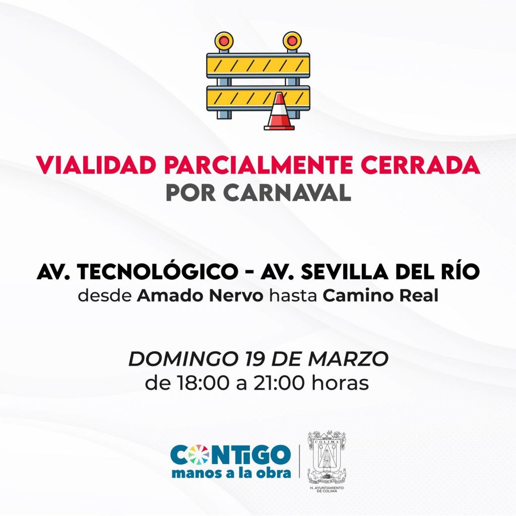 Con motivo del Carnaval, las avenidas Tecnológico y Sevilla del Río permanecerán parcialmente cerradas. Toma precauciones y utiliza vías alternas.