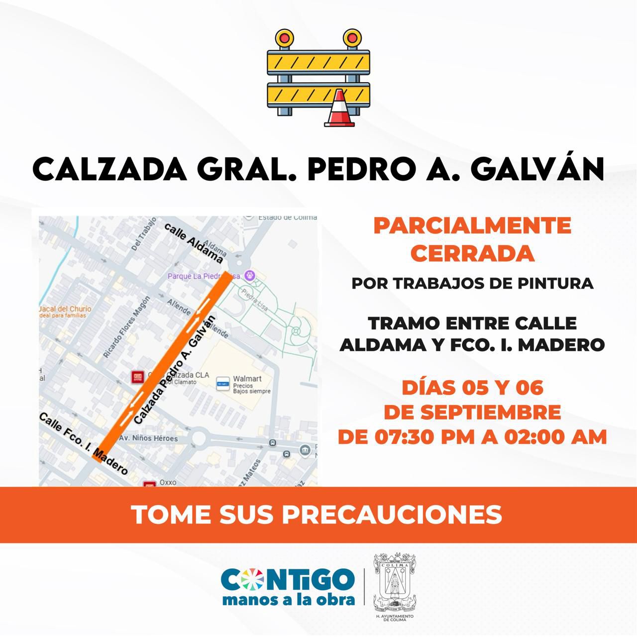 Por trabajos de balizamiento en Calzada Galván, hoy jueves y mañana viernes, permanecerá cerrada la vialidad a partir de las 7:30 de la noche y hasta las 2:00 de la madrugada.