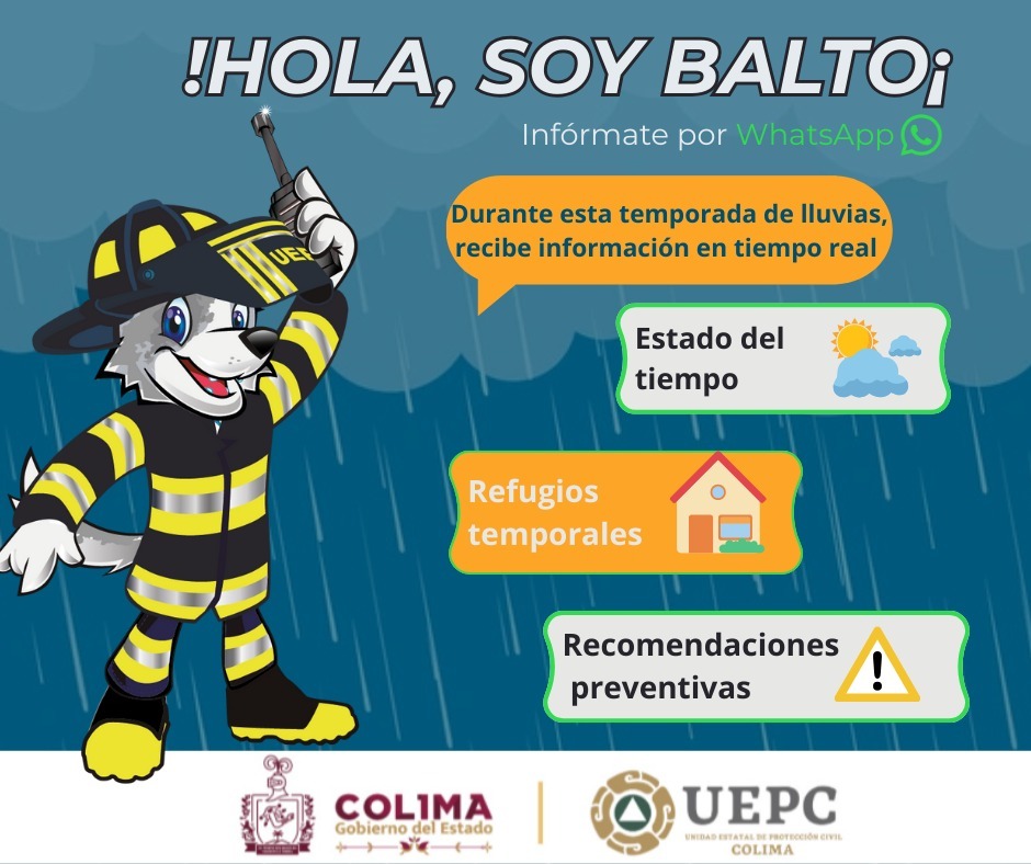 La Unidad Estatal de Protección Civil (UEPC) del Gobierno del Estado de Colima compartirá a través de su canal de difusión ‘Balto UEPC Colima’ en WhatsApp, diversas alertas preventivas y recomendaciones importantes por la temporada 2025 de lluvias y ciclones tropicales, que comprende del 15 de mayo al 30 de noviembre, por lo que reitera la invitación a toda la población a unirse de manera gratuita al canal, donde además comparte noticias verídicas en tiempo real.