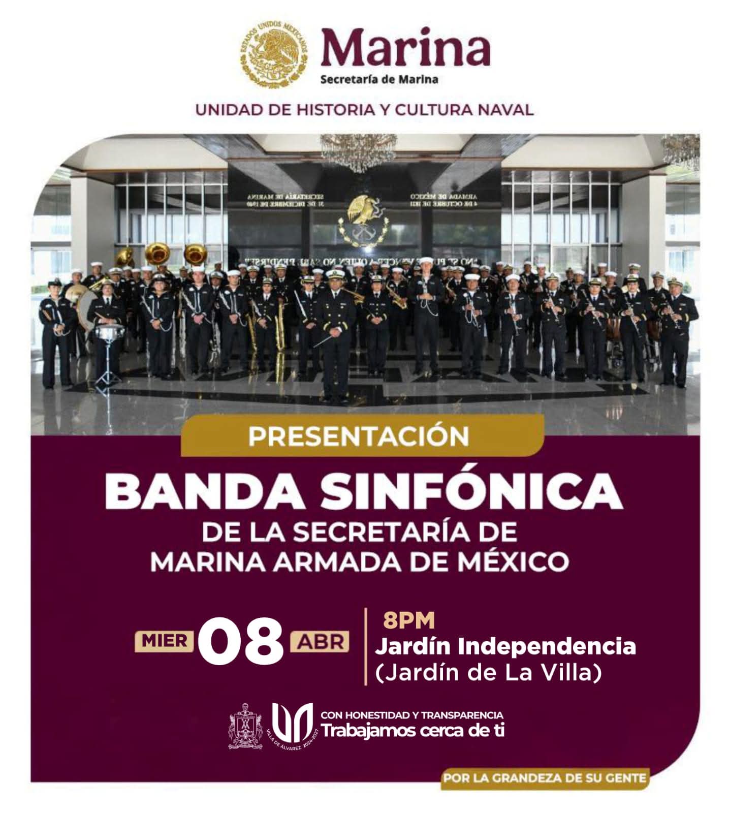 El Gobierno de Villa de Álvarez invita a disfrutar de la presentación de la Banda Sinfónica de la Secretaría de Marina Armada de México, un evento especial para compartir en familia y vivir una experiencia musical de gran nivel.