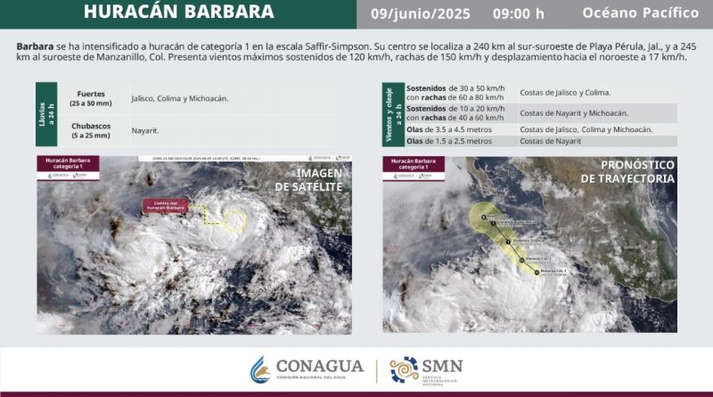 ‘Bárbara’ es el primer huracán en el Pacífico mexicano en esta temporada y presenta vientos máximos sostenidos de 120 kilómetros por hora, rachas de 150 kilómetros por hora y desplazamiento hacia el noroeste a 17 kilómetros por hora.