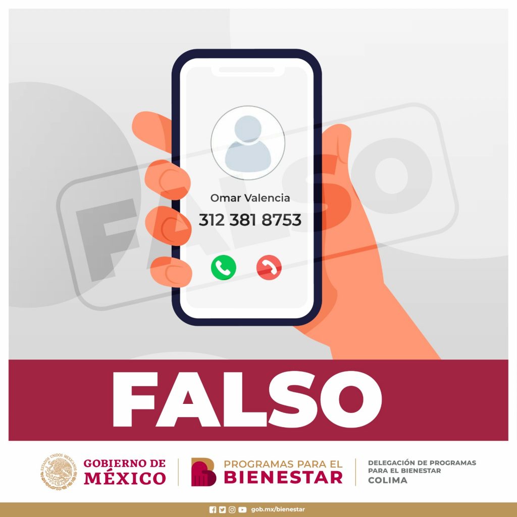 La Delegación de Programas para el Bienestar en Colima hace un atento llamado a la población para que no se deje sorprender por personas estafadoras que a través de llamadas telefónicas o mensajes de texto les pide depositar dinero a cambio de agilizar trámites relacionados con una pensión o programa social.