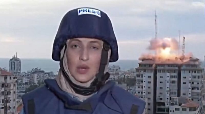 El video del momento ha sido compartido en redes sociales, en él se puede ver cuando el conductor de un programa da la palabra a la corresponsal de guerra, cuando ella va a comenzar a hablar se aprecia que detrás, junto a una torres, impacta un misil, después se escucha el estallido el cual hace que se agache y grite.
