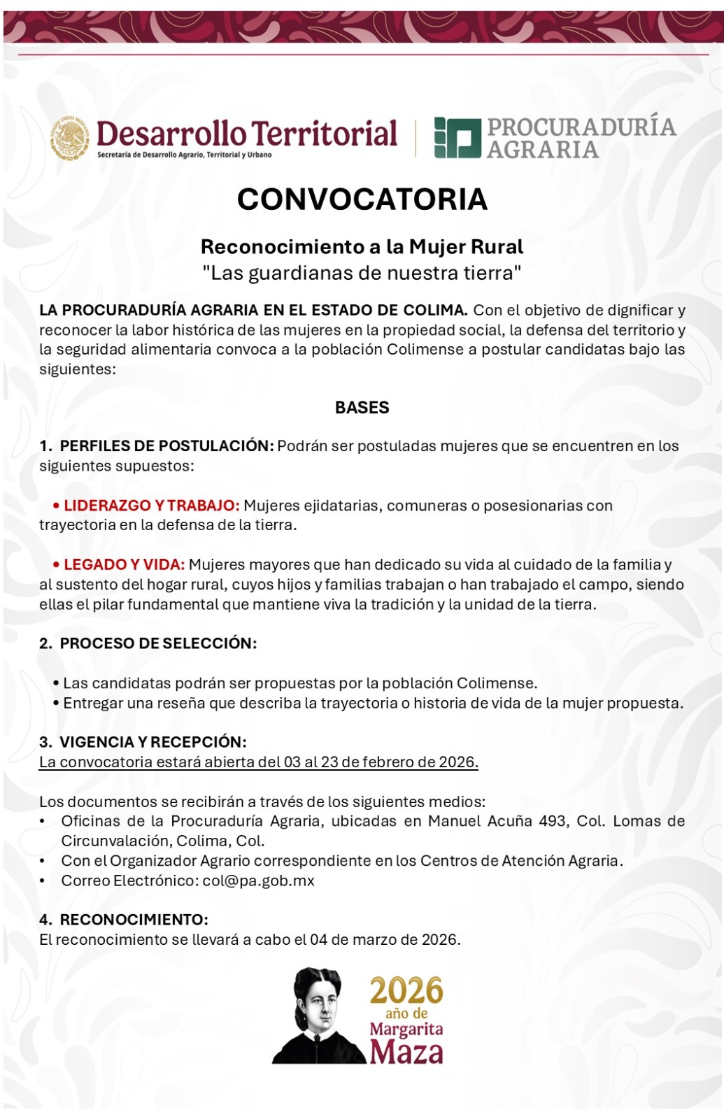 La Procuraduría Agraria en Colima invita a la población a postular a sus candidatas para el primer reconocimiento estatal a la mujer rural. Se busca premiar tanto el liderazgo agrario como el legado de las mujeres mayores que han cuidado de sus familias y el campo. El evento se llevará a cabo el 4 de Marzo de 2026.