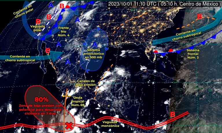 Hoy domingo 1 de octubre, un canal de baja presión sobre el occidente y centro de la República Mexicana propiciará lluvias puntuales muy fuertes en Colima, Jalisco, Michoacán y Guerrero, así como chubascos con lluvias puntuales fuertes en Nayarit, Estado de México, Morelos y Puebla.