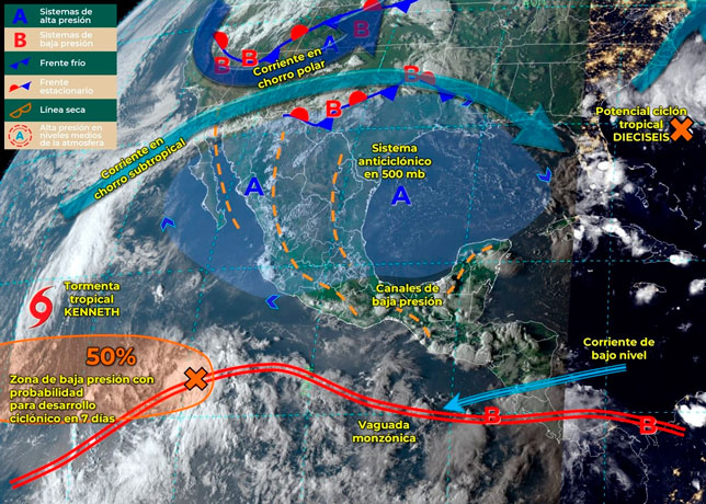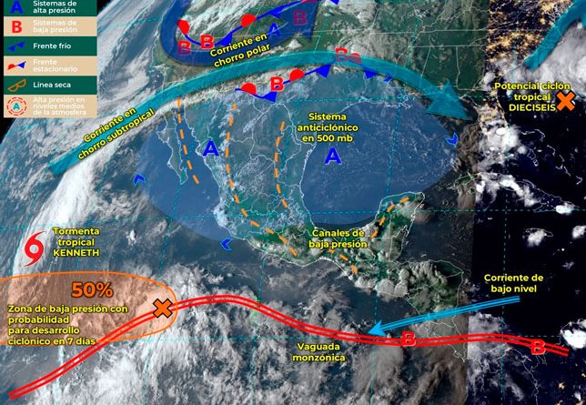 En las próximas horas y madrugada de este viernes 22 de septiembre, canales de baja presión extendidos sobre el occidente, sur y sureste de la República Mexicana, en interacción con la humedad procedente del Océano Pacífico, Golfo de México y Mar Caribe, ocasionarán lluvias puntuales fuertes en Colima, Nayarit, Jalisco, Oaxaca, Veracruz (sur), Chiapas y Tabasco, que podrían generar encharcamientos.