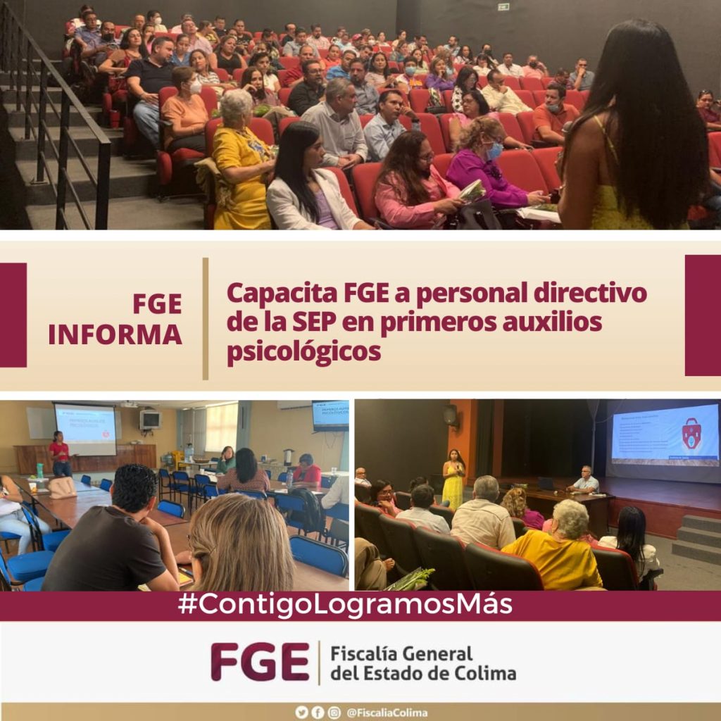 La Fiscalía General del Estado (FGE), a través del personal de la Dirección de Prevención del Delito y Atención a Víctimas impartió una capacitación dirigida al personal Directivo de la Secretaría de Educación que labora en todo el Estado y que se concentraron en los municipios de Manzanillo, Tecomán y Colima con el objetivo de proporcionarles herramientas y poder aplicar los primeros auxilios psicológicos en caso de ser necesario tanto con su alumnado como con compañeros en alguna situación de crisis.