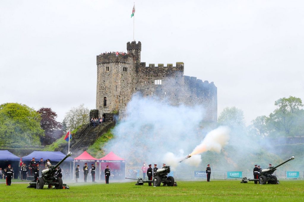 El rey de Inglaterra y Camila son acompañados por la Escolta del Soberano, compuesta por unos 160 soldados a caballo, mientras que la Banda Montada de Caballería Doméstica encabeza la procesión militar. Algunas personas ven el evento en la pantalla grande en el Castillo de Windsor.