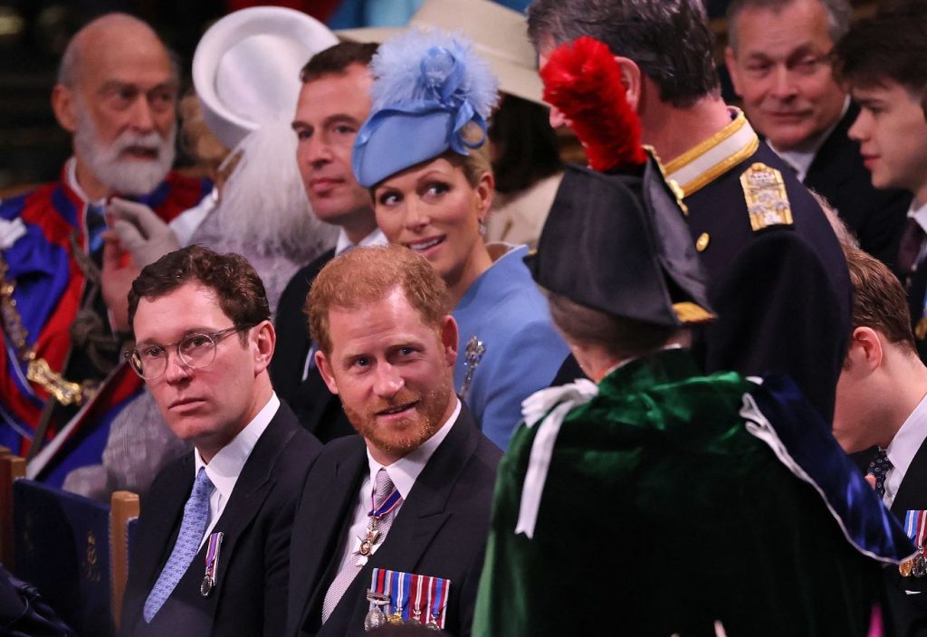 El Duque de Sussex se sienta en la tercera fila para la coronación del Rey, dos filas detrás de su hermano, el Príncipe William. Harry, con medallas prendidas en la chaqueta de su traje, habló con su prima, la princesa Beatriz, y su esposo, Edoardo Mapelli Mozzi, cuando entró a la Abadía de Westminster el sábado bajo la llovizna. También asintió y sonrió a los invitados mientras caminaba por la nave de la abadía.