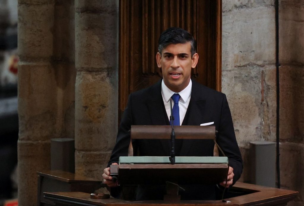 Después de que el arzobispo de Canterbury ofrece una oración, el primer ministro del Reino Unido, Rishi Sunak, hace una lectura bíblica de la Epístola a los Colosenses. Los funcionarios han dicho que, aunque Sunak es hindú, está leyendo como primer ministro, por lo que no hay ningún problema sobre su fe personal durante el servicio anglicano.