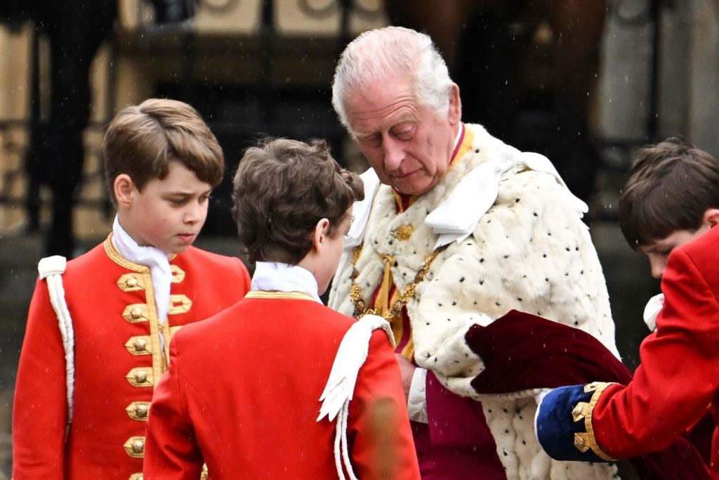 Carlos III y Camila reaparecen con la corona y portando el orbe y el cetro, saliendo de la Abadía de Westminster, donde se canta el himno nacional, cuya ceremonia religiosa ya ha terminado. El rey viste la túnica imperial, también conocida como la túnica de la herencia, y lleva el cetro y el orbe. Ambos se suben al carruaje para regresar al Palacio de Buckingham.