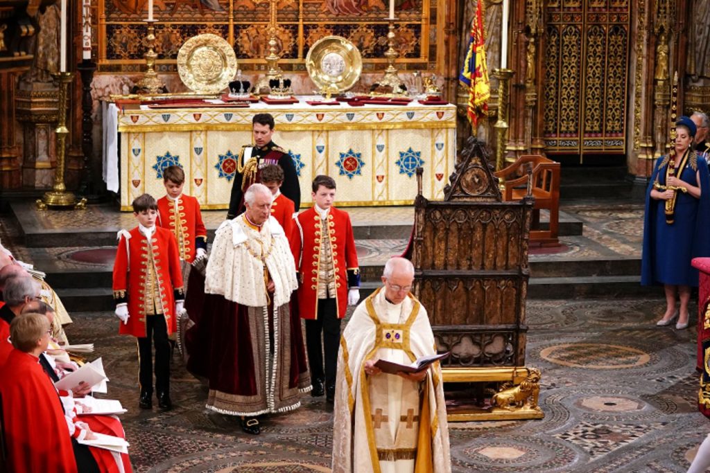 La ceremonia de coronación comenzó a las 11:00 horas (tiempo de Londres) con la entrada de Carlos III a la Abadía de Westminster un par de minutos antes para su unción como rey de Inglaterra. En la abadía y con sonidos de fanfarria, los líderes religiosos, incluido el arzobispo de York, llevan los objetos que usará Carlos III durante la procesión, entre ellos la corona de San Eduardo.