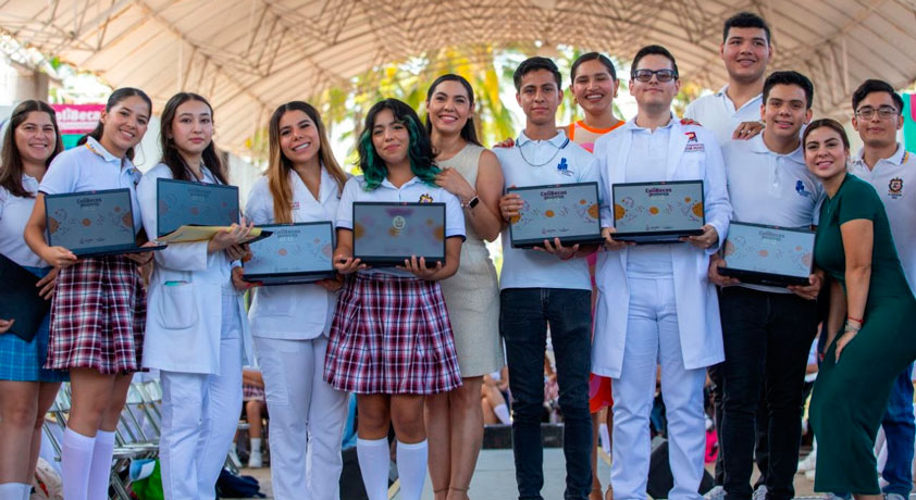 Indira Vizcaíno entregó simbólicamente laptops a Fernanda Caracheo Ramos, Miguel Hernández Alcaraz, Adolfo Sánchez Larios, Karen Morales Verduzco, Adolfo López Palacios, Héctor Ruelas Vázquez, Abril Ceballos Ochoa, Fernanda Ramírez Salas, Gerardo Aburto Beltrán, Myranda Villafuerte Cervantes.